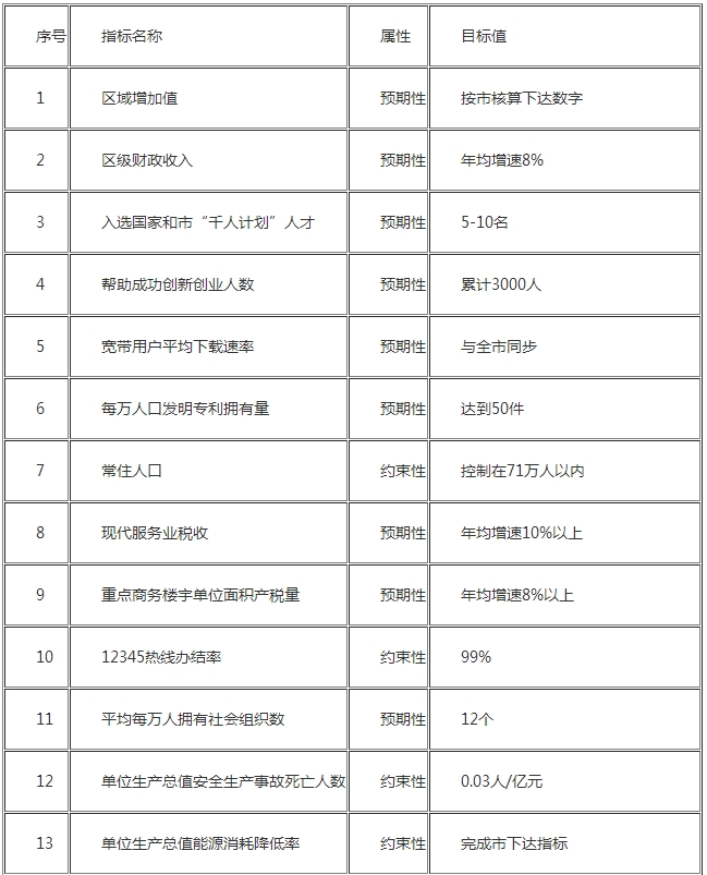 ——经济保持健康稳定增长。经济发展质量和效益不断提高,以现代服务业为主的产业结构进一步优化,产业生态环境进一步完善,商务与商业繁荣发展,总部经济、平台经济实力进一步增强,区级财政收入年均增长8%。