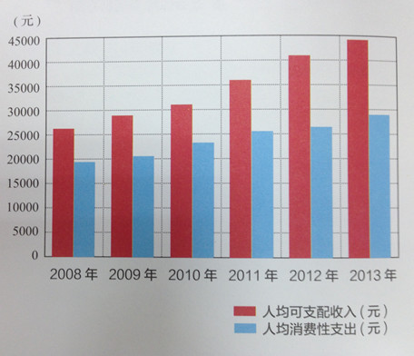 据抽样调查,2013年,上海城市居民家庭人均可支配收入达到43851元,比上年增长9.1%。扣除价格因素,实际增长6.6%;农村居民家庭人均可支配收入19208元,比上年增长10.4%,扣除价格因素,增长7.9%。