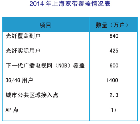 全市光纤到户840万户,实际用户达到425万,同比增长18%,家庭光纤宽带用户比例超过70%,家庭平均接入带宽达到23M,国内领先。下一代广播电视网(NGB)覆盖600万户家庭,基本实现中心城区和郊区城镇地区覆盖。